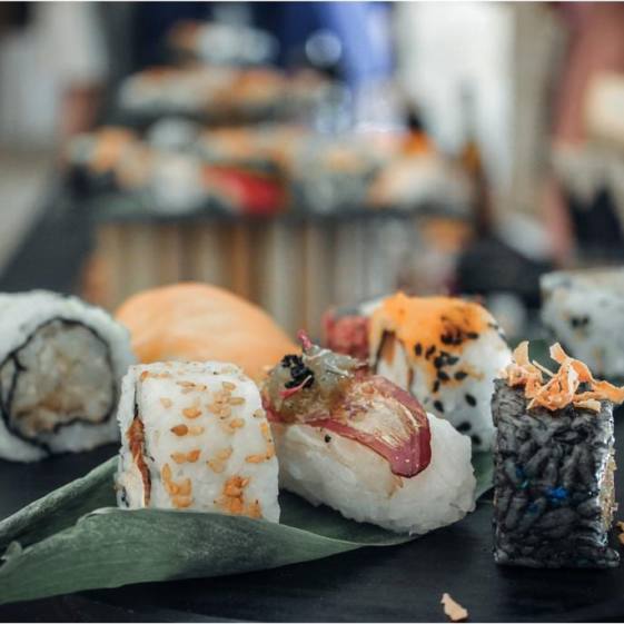 Mesa buffet de sushi compuesta de niguiris, makis, hosomakis, uramakis, origami rolls, california etc.. Todos ellos elaborados de diferentes pescados frescos como son salmón, pez mantequilla, atún, lubina y frutas frescas como aguacates, mango,fresas, etc.. y acompañado de salsa de sojai, wasabi y jengibre